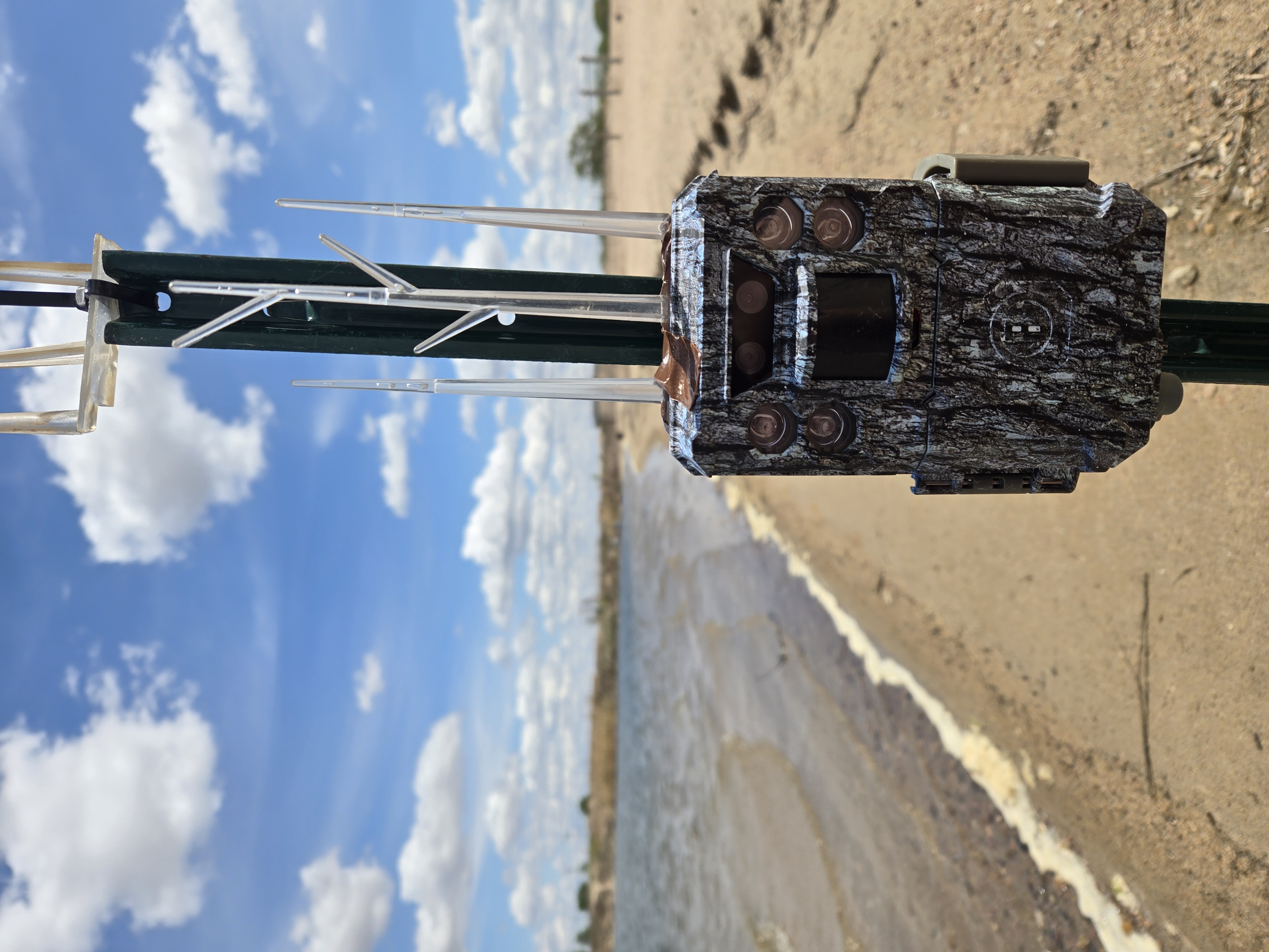 A trail camera mounted on a post is used to monitor wildlife along the shoreline.