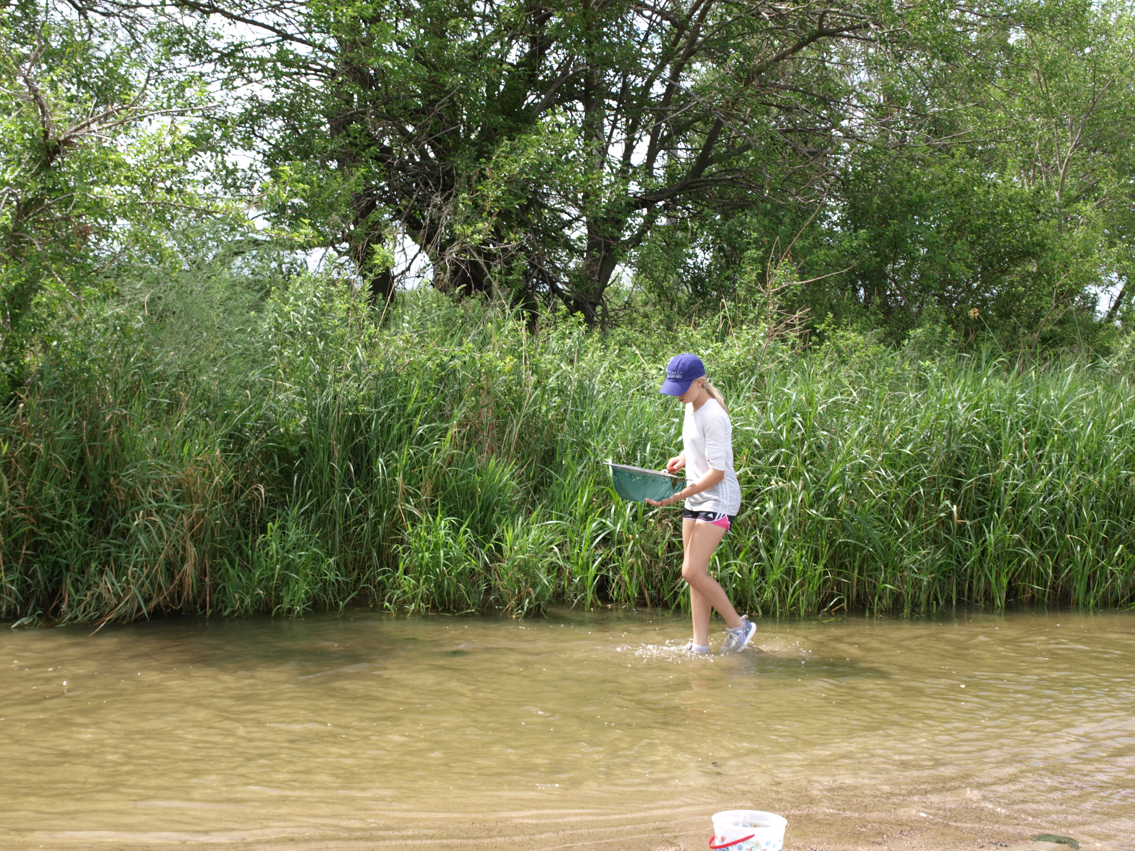 A student wades in shallow water while collecting river samples.