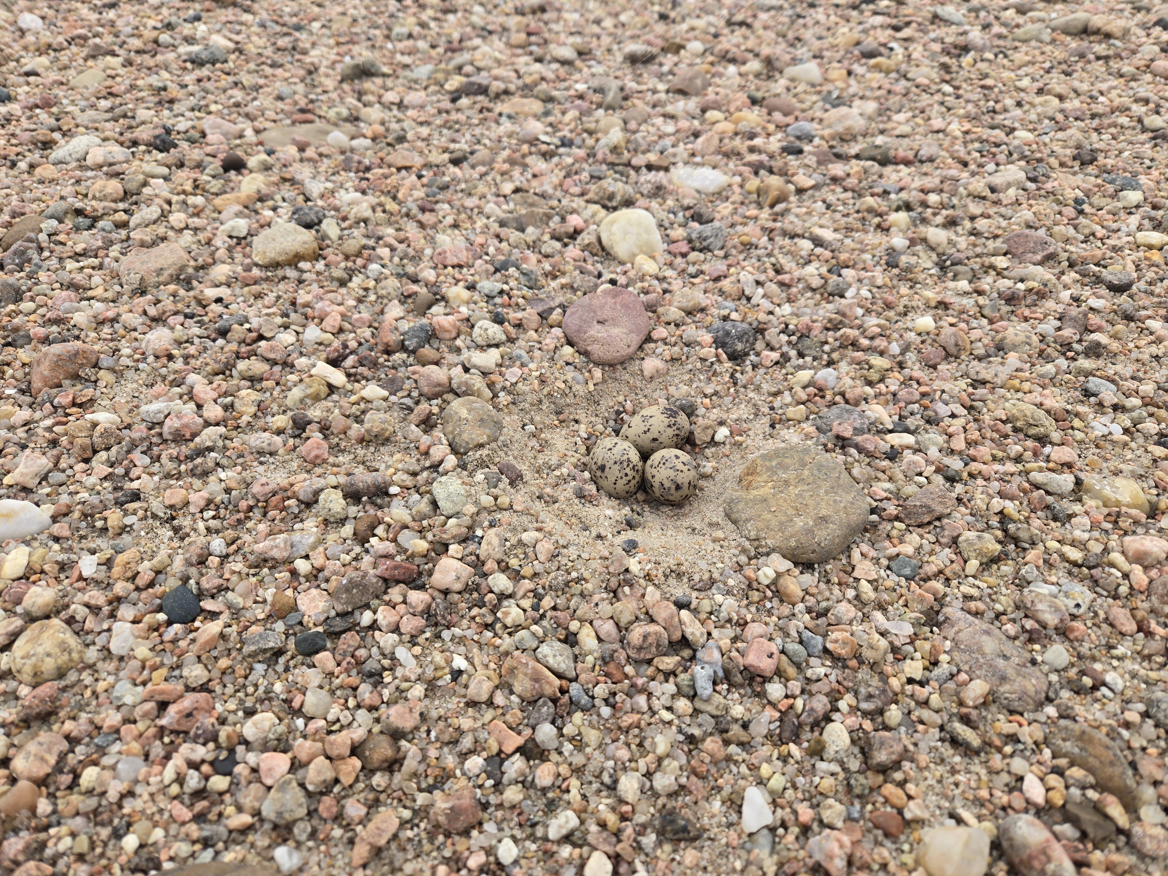 An Interior Least Tern nest containing three speckled eggs sits in a shallow scrape on an open gravel bar, blending naturally with the surrounding substrate.