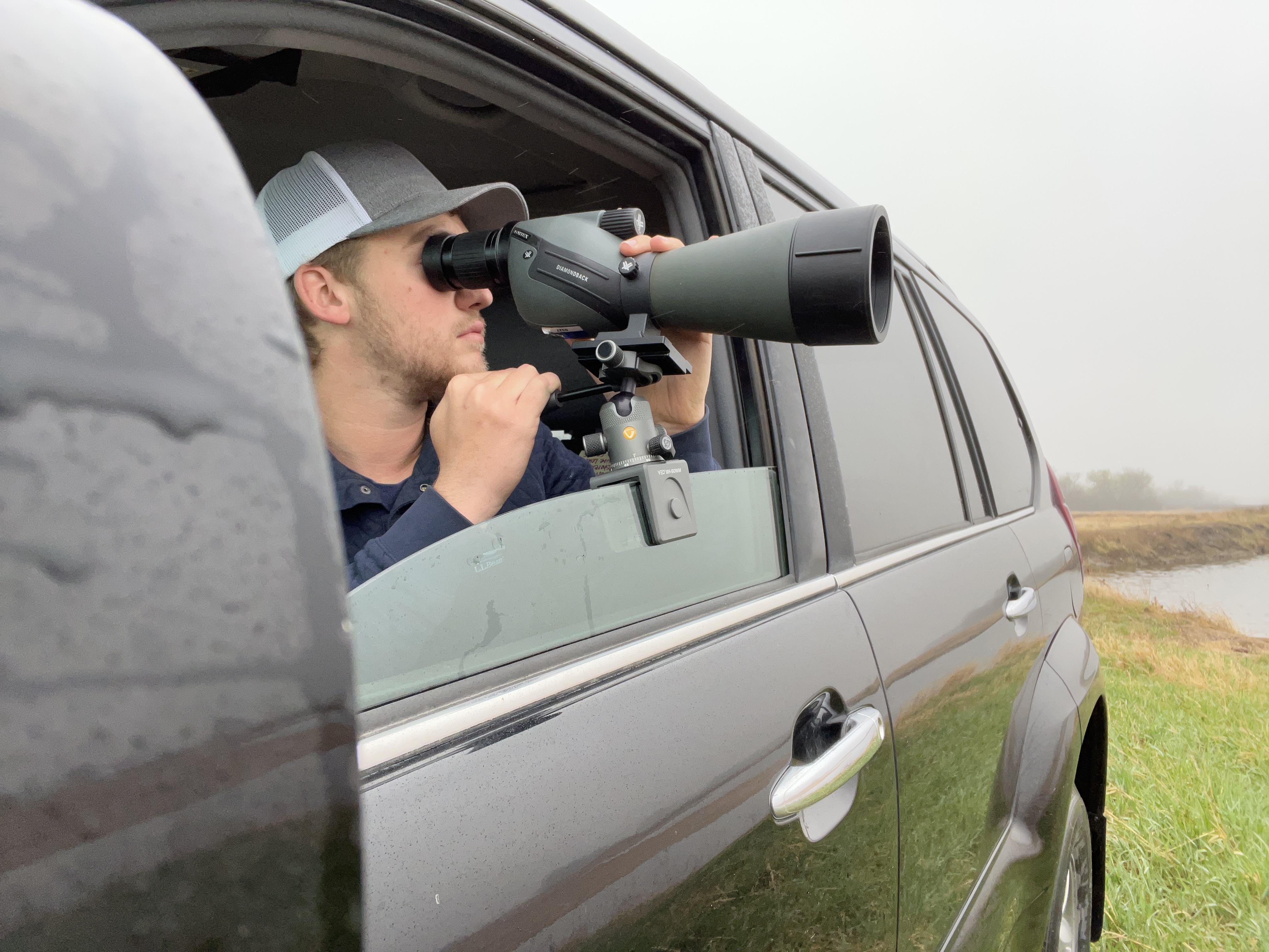 A researcher uses a spotting scope from a vehicle during field surveys.