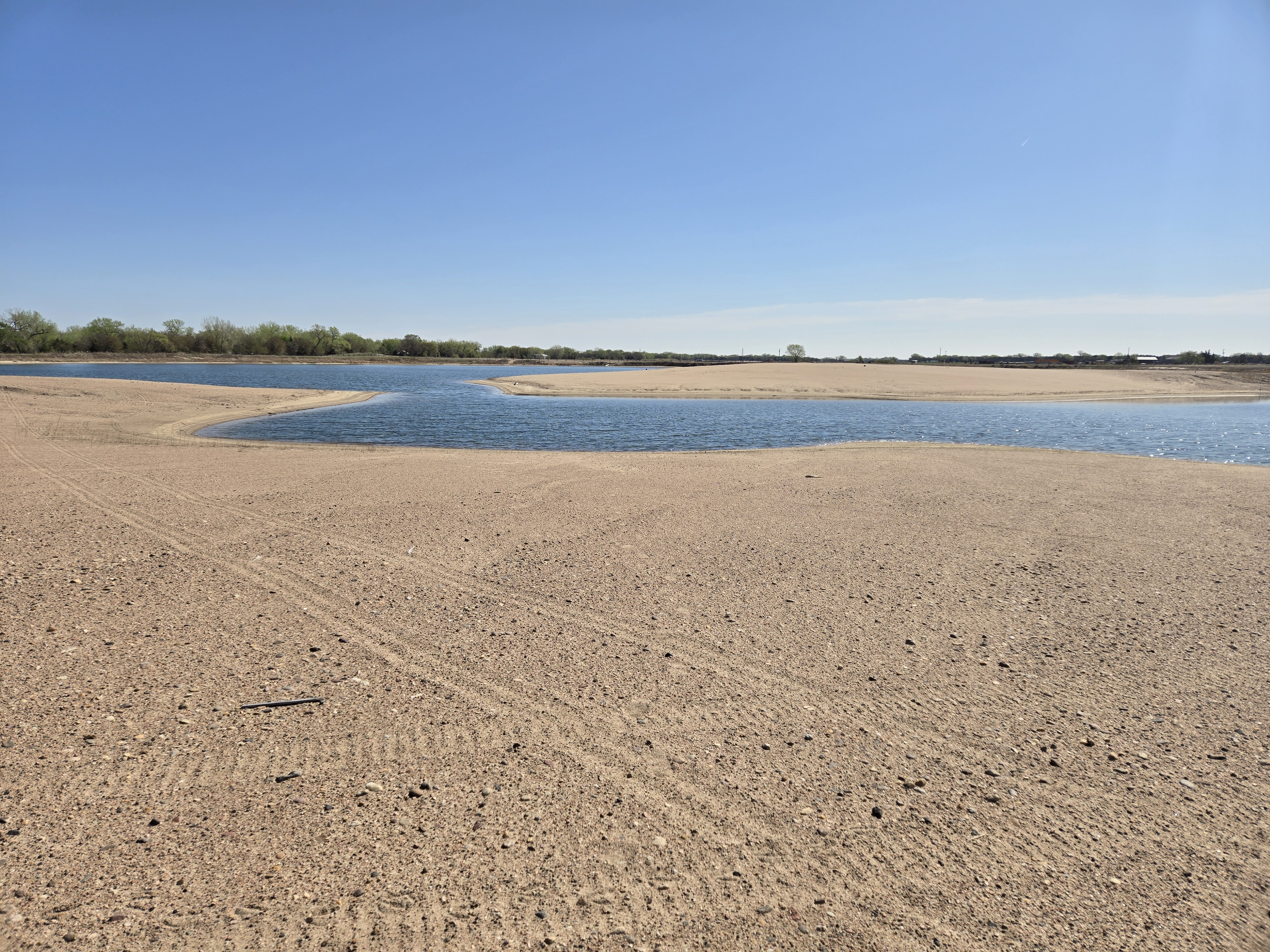 Open sand and shallow water at the Newark West Sandpit, a former gravel pit now managed by the Platte River Recovery Implementation Program to support nesting habitat for interior least terns and piping plovers.
