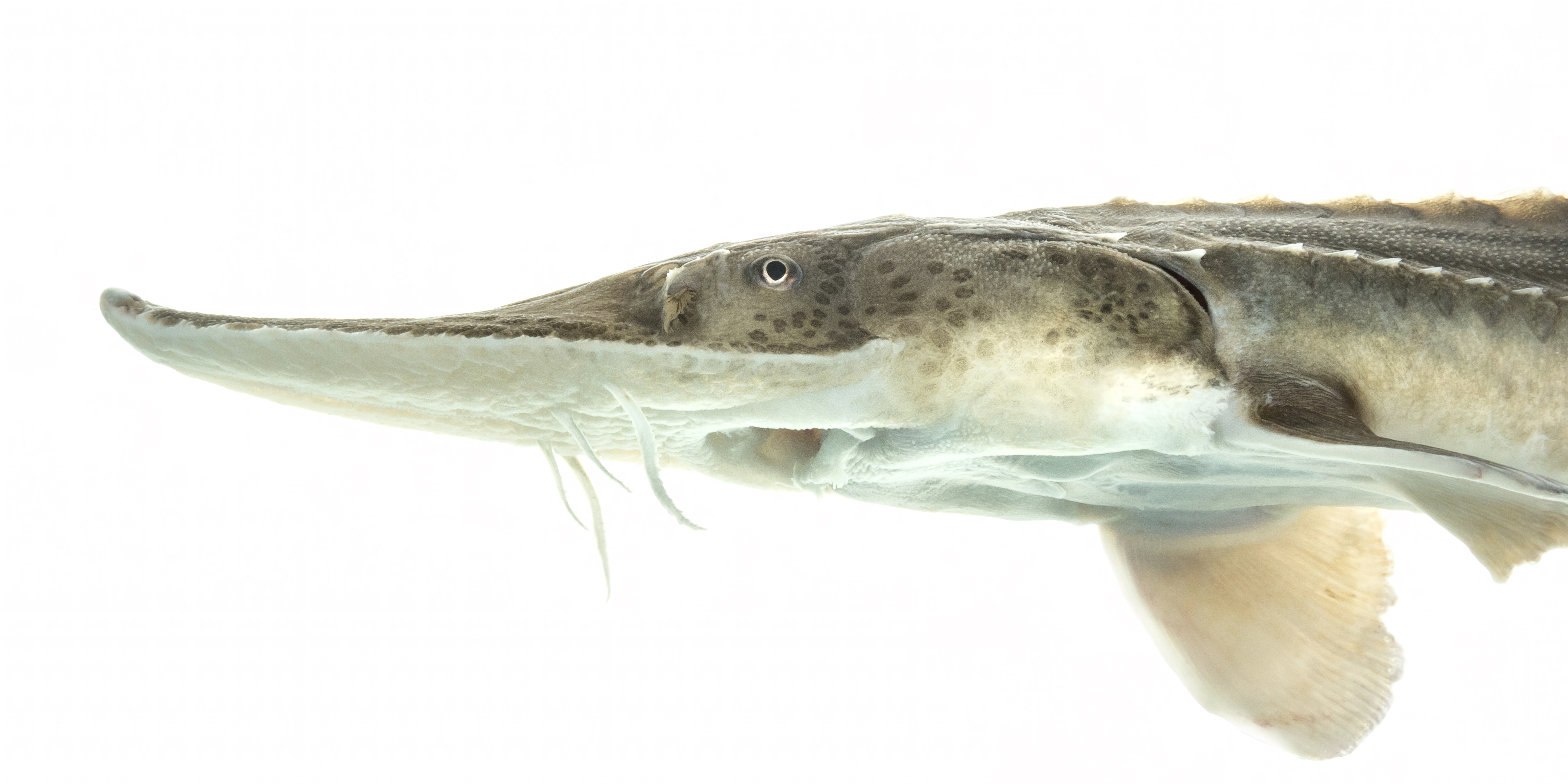 A two-year-old pallid sturgeon shown in a close-up underwater profile.
