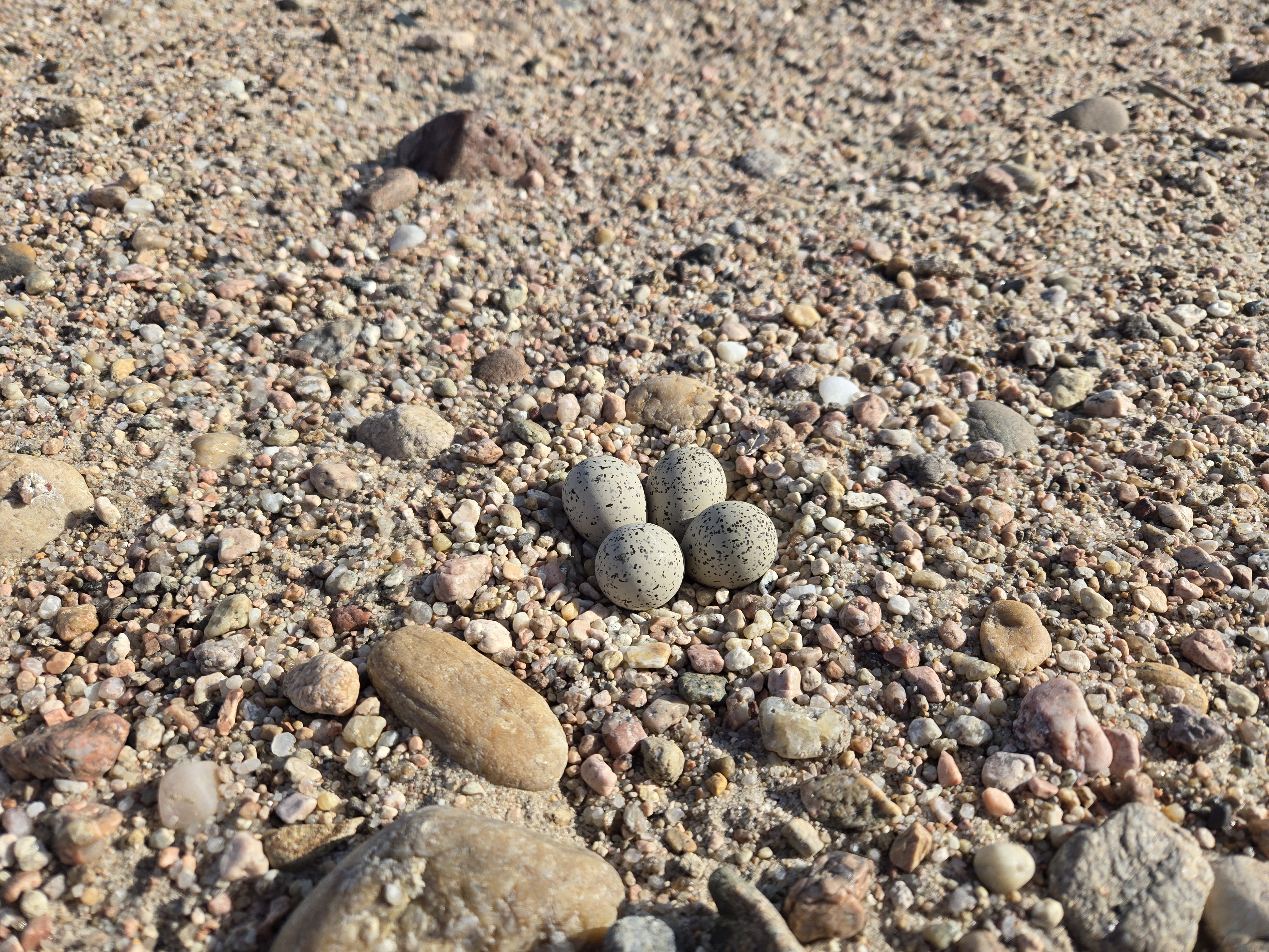 A piping plover nest containing four camouflaged eggs sits on an open gravel bar along the Central Platte River.