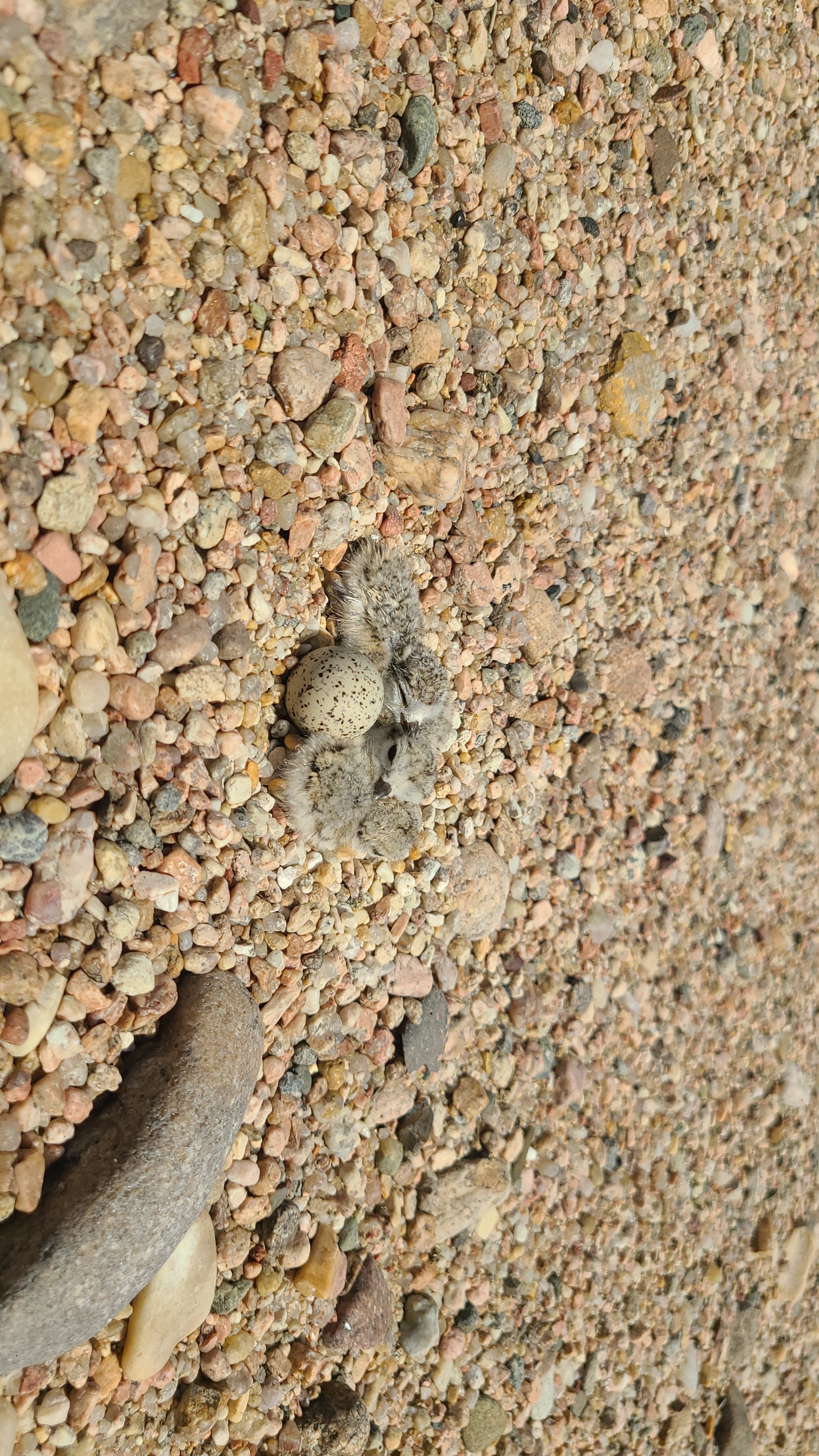 Three newly hatched piping plover chicks rest beside a remaining egg on a gravel nest.